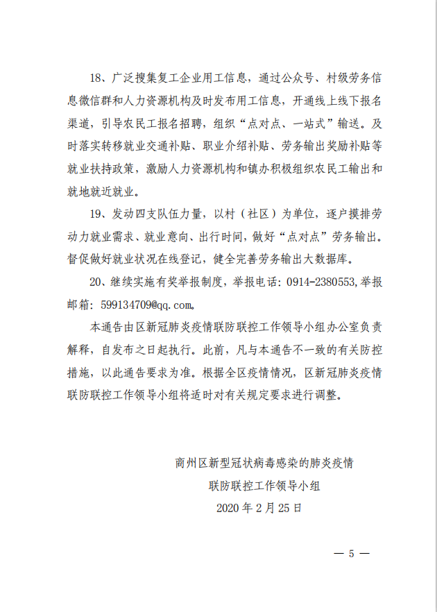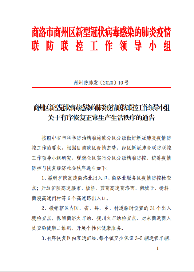 商州區(qū)新型冠狀病毒感染的肺炎疫情聯(lián)防聯(lián)控工作領(lǐng)導(dǎo)小組 關(guān)于有序恢復(fù)正常生產(chǎn)生活秩序的通告