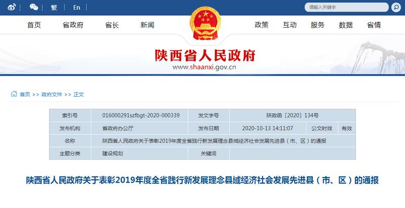 陜西表彰2019年度全省踐行新發(fā)展理念縣域經(jīng)濟社會發(fā)展先進縣