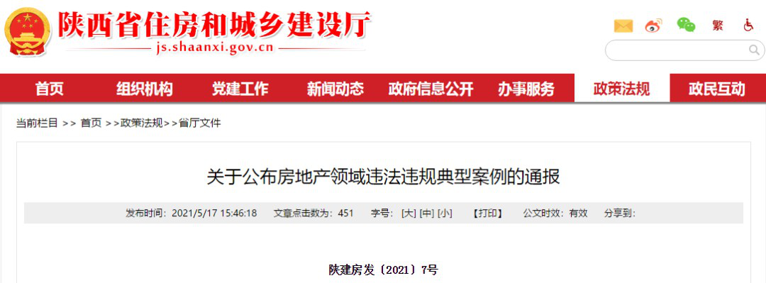 陜西省住建廳印發(fā)《關(guān)于公布房地產(chǎn)領(lǐng)域違法違規(guī)典型案例的通報(bào)》。20家房地產(chǎn)企業(yè)、7家房地產(chǎn)經(jīng)紀(jì)機(jī)構(gòu)、8 家物業(yè)服務(wù)企業(yè)違法違規(guī)行為被通報(bào)。