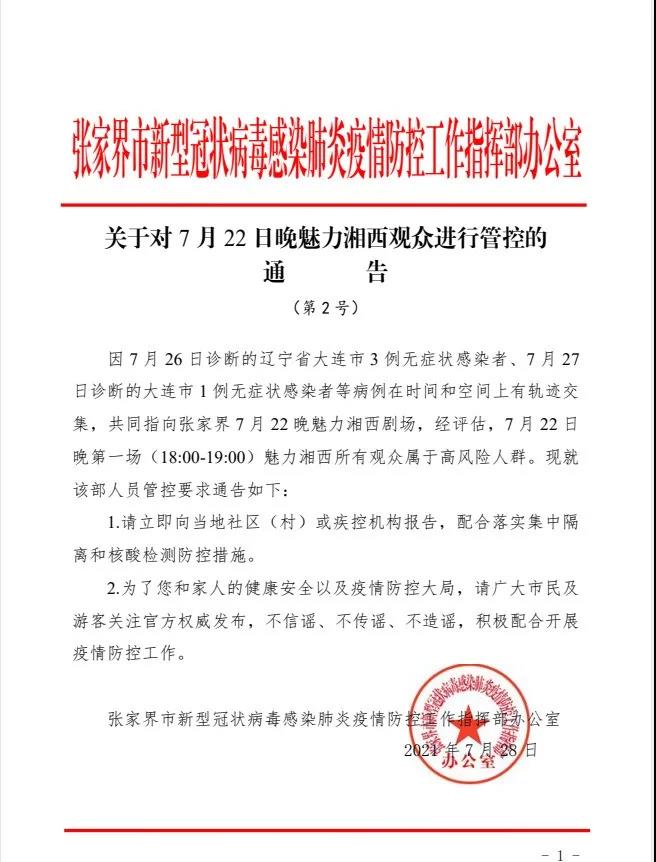 因7月26日診斷的遼寧省大連市3例無(wú)癥狀感染者、7月27日診斷的大連市1例無(wú)癥狀感染者等病例在時(shí)間和空間上有軌跡交集,共同指向張家界7月22晚魅力湘西劇場(chǎng),經(jīng)評(píng)估,7月22日晚第一場(chǎng)(18:00-19:00)魅力湘西所有觀眾屬于高風(fēng)險(xiǎn)人群?,F(xiàn)就該部人員管控要求通告如下: