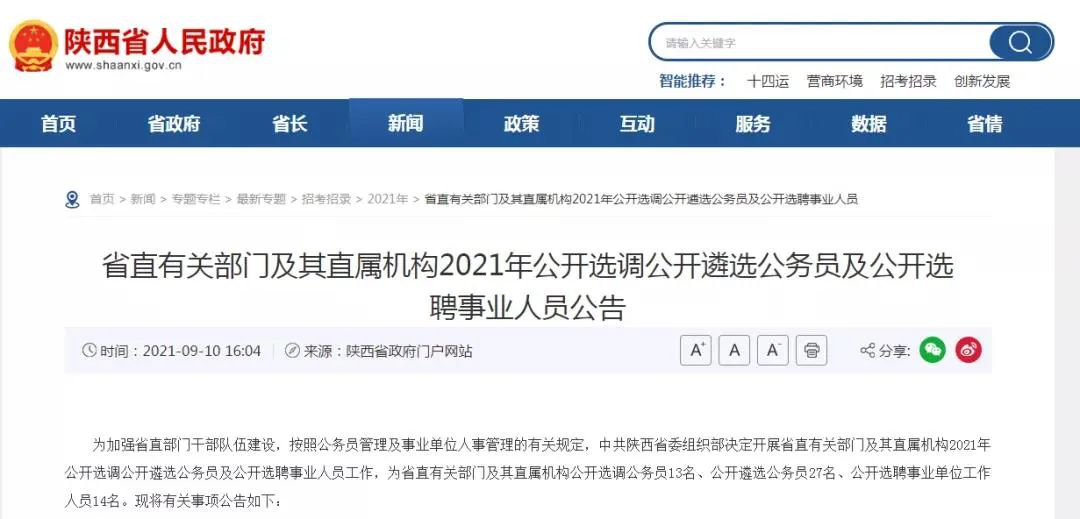 為加強省直部門干部隊伍建設(shè),按照公務(wù)員管理及事業(yè)單位人事管理的有關(guān)規(guī)定,中共陜西省委組織部決定開展省直有關(guān)部門及其直屬機構(gòu)2021年公開選調(diào)公開遴選公務(wù)員及公開選聘事業(yè)人員工作,為省直有關(guān)部門及其直屬機構(gòu)公開選調(diào)公務(wù)員13名、公開遴選公務(wù)員27名、公開選聘事業(yè)單位工作人員14名。
