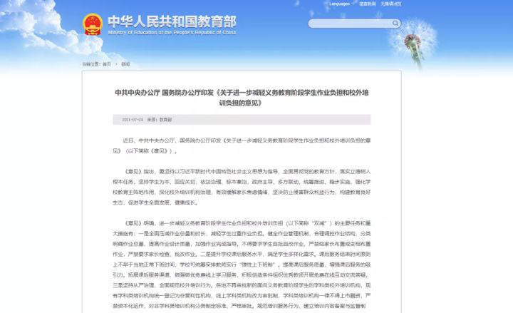 2021年7月24日,中共中央辦公廳、國(guó)務(wù)院辦公廳印發(fā)《關(guān)于進(jìn)一步減輕義務(wù)教育階段學(xué)生作業(yè)負(fù)擔(dān)和校外培訓(xùn)負(fù)擔(dān)的意見(jiàn)》。“雙減”政策指出,要全面壓減作業(yè)總量和時(shí)長(zhǎng),減輕學(xué)生過(guò)重作業(yè)負(fù)擔(dān)。