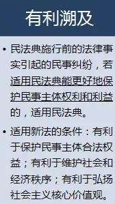 適用民法典的規(guī)定更有利于保護(hù)民事主體合法權(quán)益,更有利于維護(hù)社會和經(jīng)濟(jì)秩序,更有利于弘揚(yáng)社會主義核心價值觀的適用新法。(有利溯及原則)