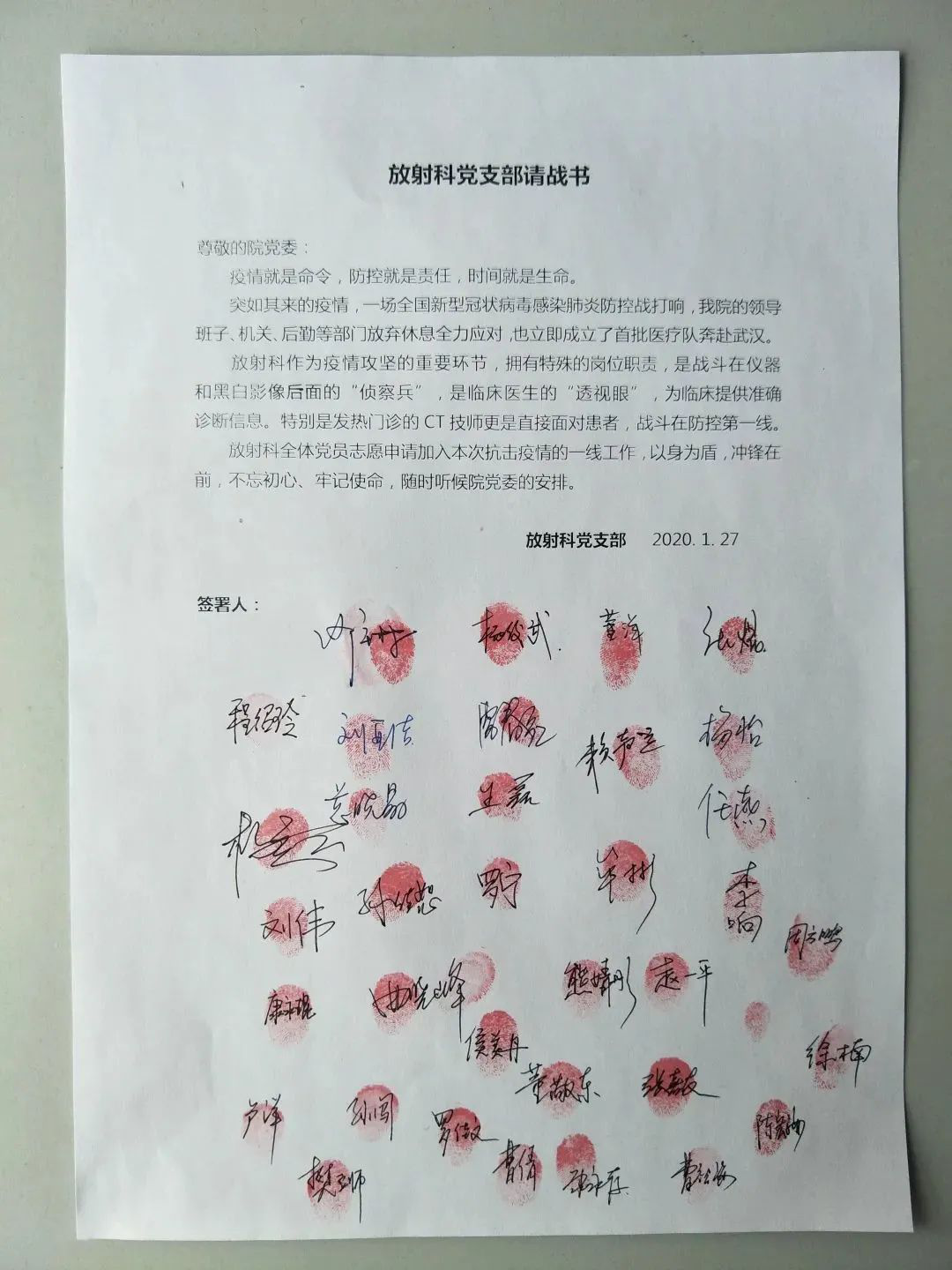 2020年1月27日,沙琳所在放射科黨支部黨員簽署抗疫請戰(zhàn)書