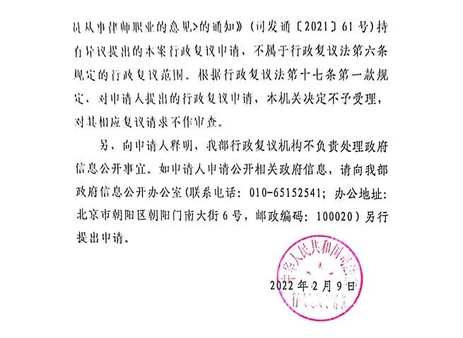 不予受理行政復(fù)議申請(qǐng)決定書(2022)司復(fù)決11號(hào) 申請(qǐng)人:謝雄雅、宋乙、史興江、孟慶東、李祖中、周本國、薛繼友、苗玉紅、張樹生、甄飛、張斌華、張鳳海、曹志高、魯軍、趙延輝、李興軍、羅學(xué)寬、施福新、楊建、關(guān)欣、王煥新、王玉波、張亞平、李雅克、陳瑋紅、楊福金、譚伯峰、龍鐵、于試貴、韋萍、蓋佳龍、王小明、王洪濤、李富強(qiáng)、陳琳、魏景洲、劉灼、李娜、王京龍、洪湖、姜吉友、姜麗鳳、夏賦、張德剛、毛建、李賀玲、丁留長、張逢閣、李志彥、曹東榮、許崇國、衛(wèi)紅、耿俊清、王士棟、何永華、司佳云、黃竹斌、左明濤、周宏斌、王利順、曉崗、孫連興被申請(qǐng)人:中華人民共和國司法部住所地:北京市朝陽區(qū)朝陽門南大街6號(hào)法定代表人:唐一軍,部長經(jīng)審查,申請(qǐng)人因?qū)Α蛾P(guān)于<關(guān)于進(jìn)一步規(guī)范法院、檢察院離任人員從事律師職業(yè)的意見>相關(guān)規(guī)定適用問題的通知》(律工組[2021]19號(hào))及《最高人民法院、最高人民檢察院、司法部印發(fā)<關(guān)于進(jìn)一步規(guī)范法院、檢察院離任人員從事律師職業(yè)的意見>的通知》(司發(fā)通[2021]61號(hào))持有異議提出的本案行政復(fù)議申請(qǐng),不屬于行政復(fù)議法第六條規(guī)定的行政復(fù)議范圍。根據(jù)行政復(fù)議法第十七條第一款規(guī)定,對(duì)申請(qǐng)人提出的行政復(fù)議申請(qǐng),本機(jī)關(guān)決定不予受理,對(duì)其相應(yīng)復(fù)議請(qǐng)求不作審查。另,向申請(qǐng)人釋明,我部行政復(fù)議機(jī)構(gòu)不負(fù)責(zé)處理政府信息公開事宜。如申請(qǐng)人申請(qǐng)公開相關(guān)政府信息,請(qǐng)向我部政府信息公開辦公室(聯(lián)系電話:010-65152541;辦公地址:北京市朝陽區(qū)朝陽門南大街6號(hào),郵政編碼:100020)另行提出申請(qǐng)。