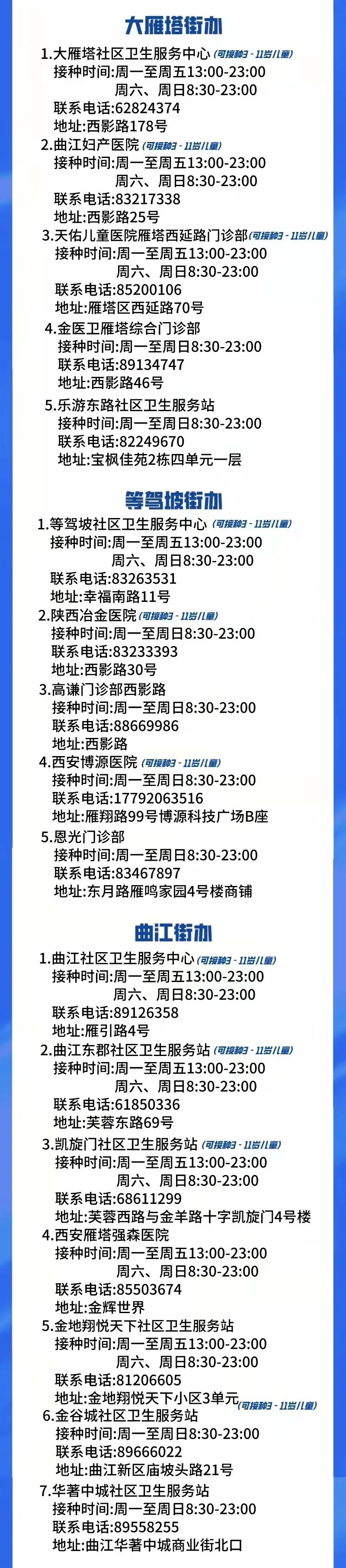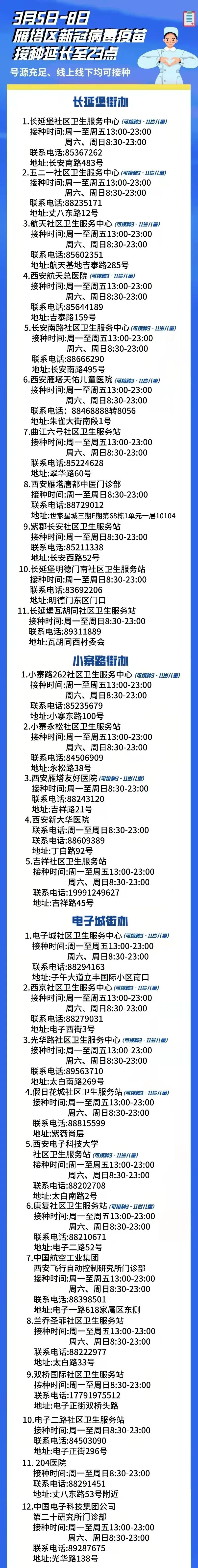 ▲為全力推進(jìn)新冠病毒疫苗同源加強(qiáng)和序貫加強(qiáng)接種工作,西安市雁塔區(qū)58家新冠病毒疫苗接種點(diǎn)位,從3月5日至8日,各種點(diǎn)位時(shí)間均延長(zhǎng)至晚上23點(diǎn)。現(xiàn)將各接種點(diǎn)位信息公布如下,請(qǐng)符合接種條件的市民根據(jù)自己的實(shí)際情況,自行安排接種時(shí)間,盡早完成全程接種,盡早接種加強(qiáng)劑次。