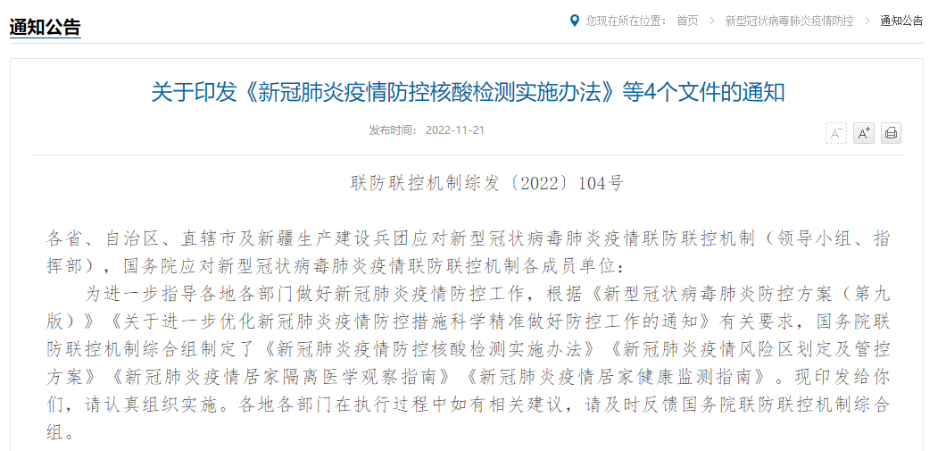 為進一步指導各地各部門做好新冠肺炎疫情防控工作,根據(jù)《新型冠狀病毒肺炎防控方案(第九版)》《關(guān)于進一步優(yōu)化新冠肺炎疫情防控措施 科學精準做好防控工作的通知》有關(guān)要求,國務院聯(lián)防聯(lián)控機制綜合組制定了《新冠肺炎疫情防控核酸檢測實施辦法》《新冠肺炎疫情風險區(qū)劃定及管控方案》《新冠肺炎疫情居家隔離醫(yī)學觀察指南》《新冠肺炎疫情居家健康監(jiān)測指南》。