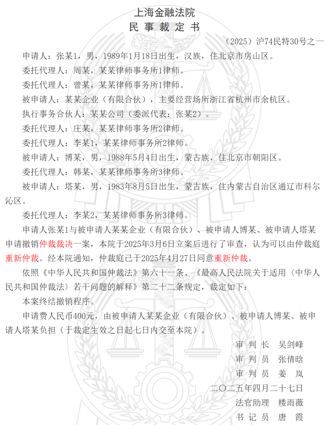 最近,上海金融法院和廣州市中級人民法院發(fā)布兩份民事裁定,通知兩家機構(gòu)的仲裁庭重新仲裁。