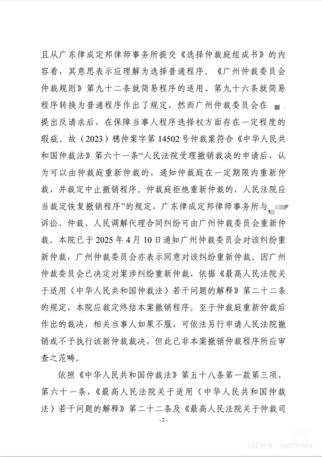 其中,上海金融法院的民事裁定認為,經(jīng)過司法審查,認為案件可以通過重新仲裁來實現(xiàn)補救。同樣,廣州中級人民法院在審查一件曾經(jīng)轟動一時的關(guān)于律師高額賠償?shù)闹俨貌脹Q撤裁案件時,也是注意到程序的問題,認為通過重新仲裁可以解決,于是通知仲裁庭重新仲裁,仲裁庭同意后,廣州中院作出民事裁定,終結(jié)了撤裁程序。