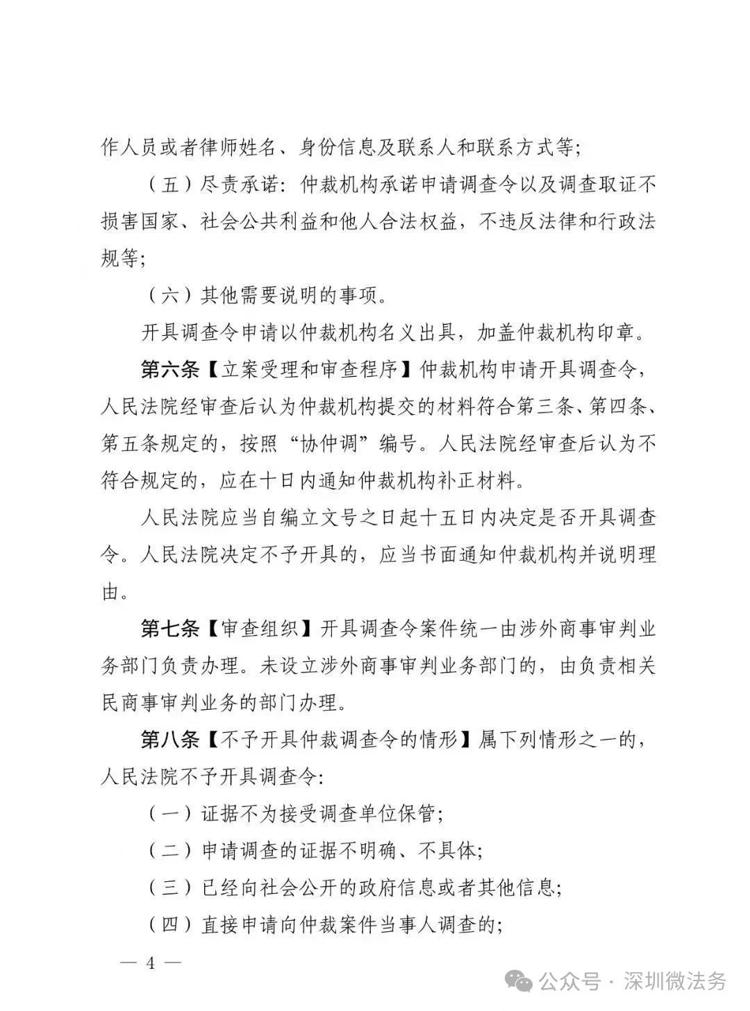第六條【立案受理和審查程序】仲裁機(jī)構(gòu)申請(qǐng)開(kāi)具調(diào)查令,人民法院經(jīng)審查后認(rèn)為仲裁機(jī)構(gòu)提交的材料符合第三條、第四條、第五條規(guī)定的,按照“協(xié)仲調(diào)”編號(hào)。人民法院經(jīng)審查后認(rèn)為不