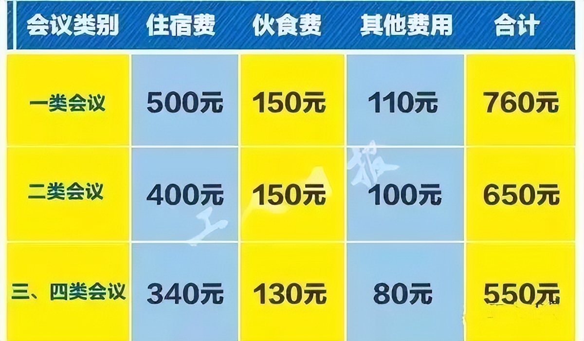 《辦法》明確了會議費綜合定額標準:一類會議上限為每人每天760元,二類會議上限為每人每天650元,三四類會議上限為每人每天550元。