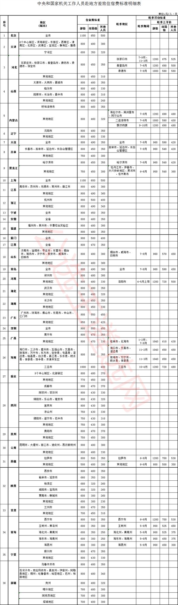 部級官員赴天津、河北、山西、內(nèi)蒙、遼寧、大連、吉林等地,住宿費標準每天限額多為800元。