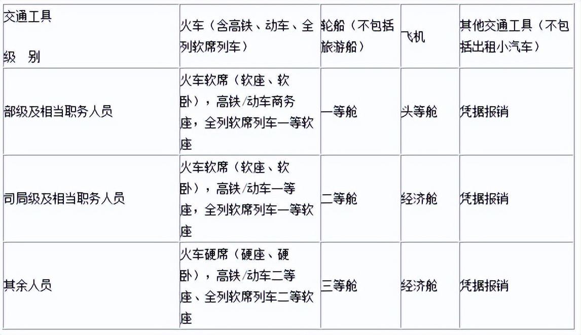 城市間交通費是指工作人員因公到常駐地以外地區(qū)出差乘坐火車、輪船、飛機等交通工具所發(fā)生的費用。出差人員應(yīng)當按規(guī)定等級乘坐交通工具。乘坐交通工具的等級見下表: