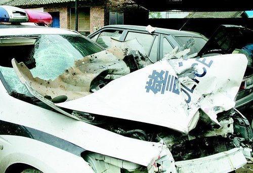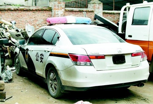 隨后,記者在山陽縣天宏汽修廠見到該肇事車輛,該車是一輛嶄新的廣東本田雅閣制式警車,車身上噴著“公安”字樣,車頂安裝著警燈,該車沒有懸掛車牌,該警車前部已經(jīng)被撞得面目全非,車的前引擎蓋已嚴(yán)重變形,前擋風(fēng)玻璃也已破碎,安全氣囊全部打開。