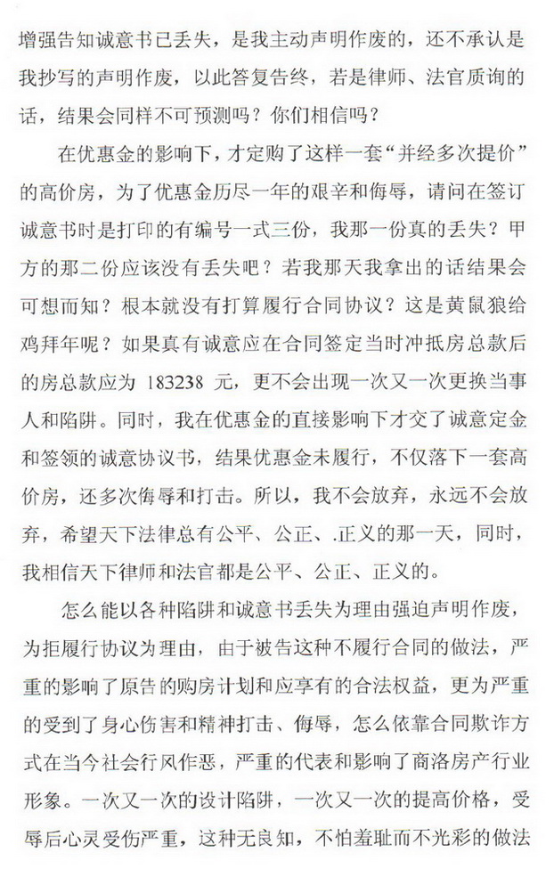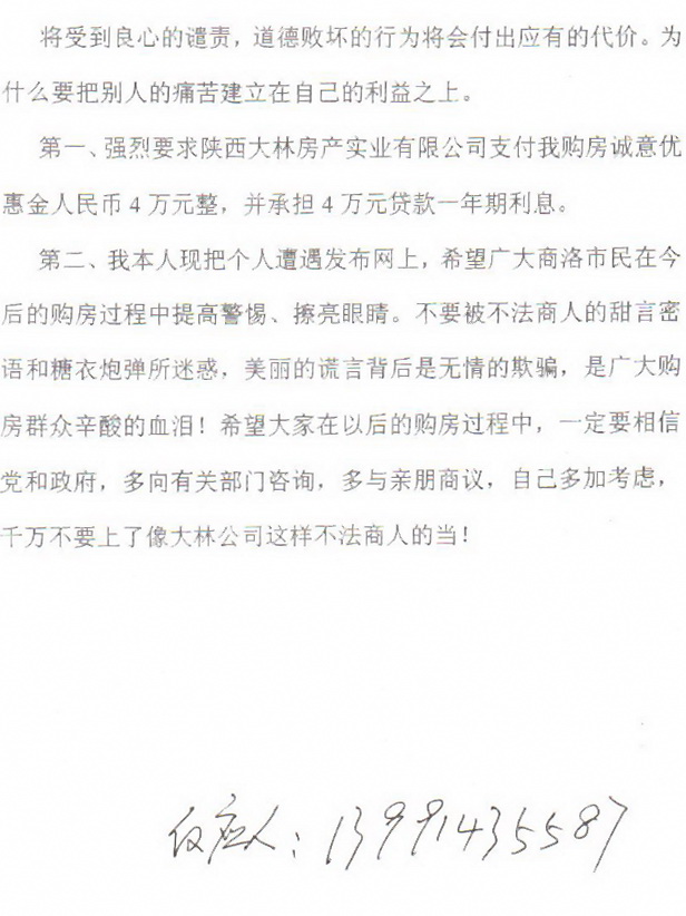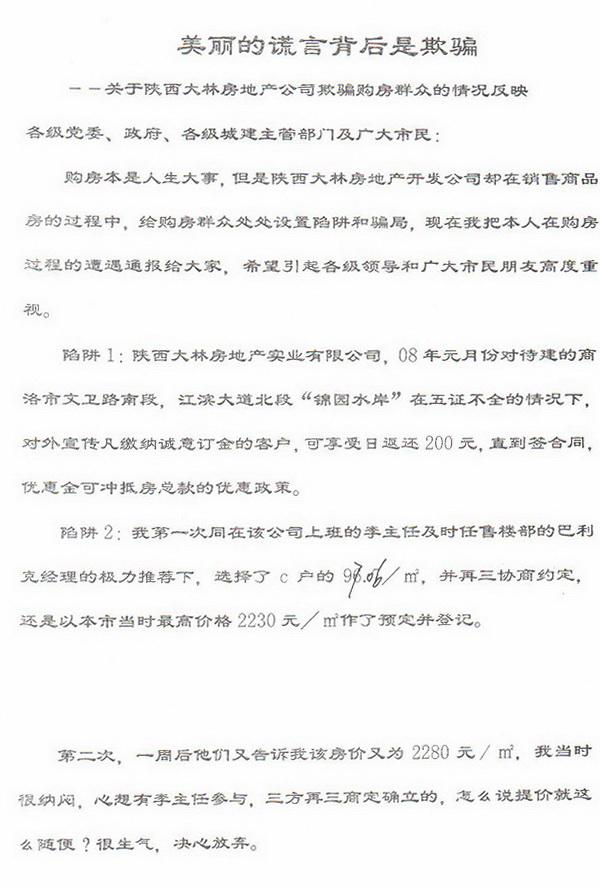 網(wǎng)站辦理:本網(wǎng)站已于2009年11月4日上午,將反映人于XX同志的淚訴材料及相關(guān)資料,分別專人送達(dá)商洛市城建局辦公室(張敏簽收)。陜西大林房地產(chǎn)公司李主任及經(jīng)理(未透露姓名)見到資料后,李主任說:“材料我不接受,你可以在網(wǎng)上發(fā),那怕登報(bào)紙都行,我們不害怕帶來影響”。