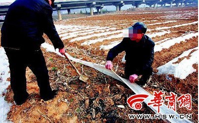在村民帶領(lǐng)下,記者來到寇家溝村一組上百畝馬鈴薯示范地。打開地膜,村民用鐵鍬把地一翻,里面根本沒有馬鈴薯種子。隨后,村民又隨機(jī)翻了幾十處地,地膜下面仍舊沒有馬鈴薯。一不愿意透露姓名的村民介紹,他家的地根本沒有翻耕,幾天前,有人把他家的地用地膜給蓋上了,類似這種情況很多。之后才知道,省上有關(guān)部門要到山陽參觀馬鈴薯種植示范,由于該村離縣城太近,才出現(xiàn)這種“糊弄”的辦法。